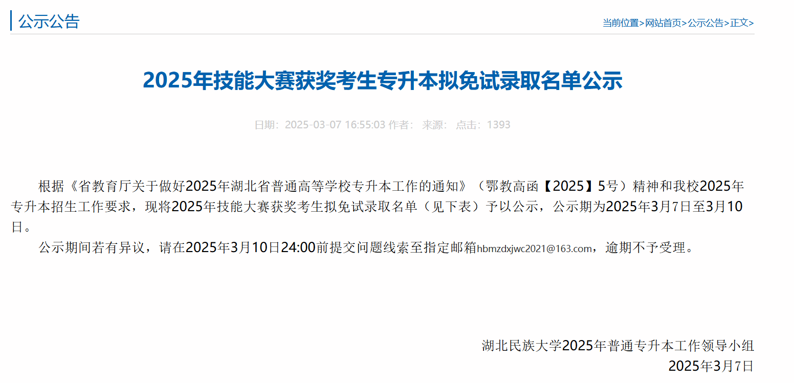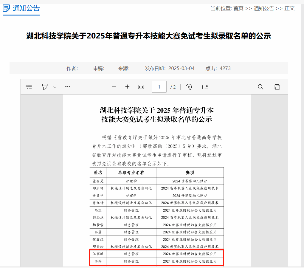 近日,湖北省教育厅公布2025年普通高等公司专升本免试录取名单,公司tyc122cc太阳成集团2022级大数据与会计专业李莎,汪家洪两位同学在2024世界职业院校技能大赛的“业财税融合大数据应用”赛项中获得铜奖,取得技能大赛免试专升本资格,被湖北科技公司录取。同时,郭西平,江子豪,殷萌萌三位同学在2024年湖北省职业院校技能大赛(高职组)会计实务赛项中获一等奖,获得技能大赛免试专升本资格,被湖北民族大学会计学专业录取。